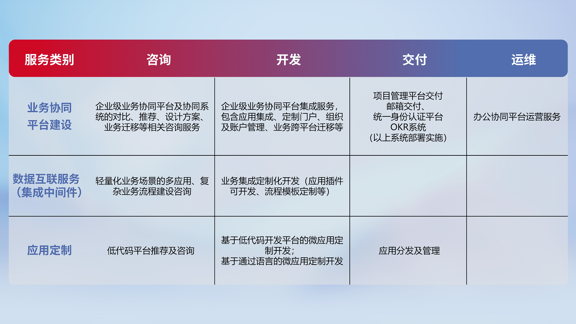 针对钉钉、、、企微、、、、IDaas等平台级产品提供产品的规划、、方案、、交付、、、定制化开发等服务,,,实现如统一协同办公、、、智能客户服务、、混合会议管理、、、智能数据查询、、、、等业务场景,,实现数字化转型。。。