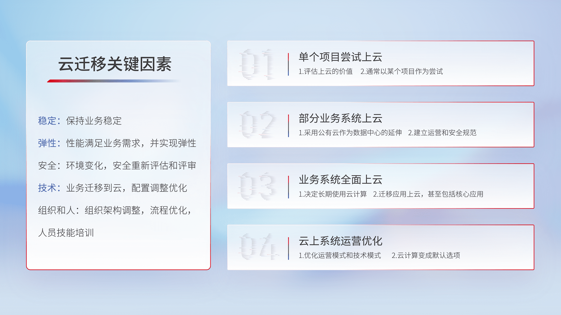 结合实际业务,,,从规划设计、、、、云平台选型、、、云原生改造、、、、数据迁移、、、集成交付,,迁移全过程为客户识别最佳上云路径,,,,做好风险识别管理,,设计网络架构、、身份权限、、、、安全审计合规、、、、操作审计、、、、日志审计、、、监控告警策略、、、、多站点容灾设计等,,,,对云上基础设施进行整体规划,,,提升IT治理水平,,,,以满足弹性、、、高可用、、高性能的需求。。