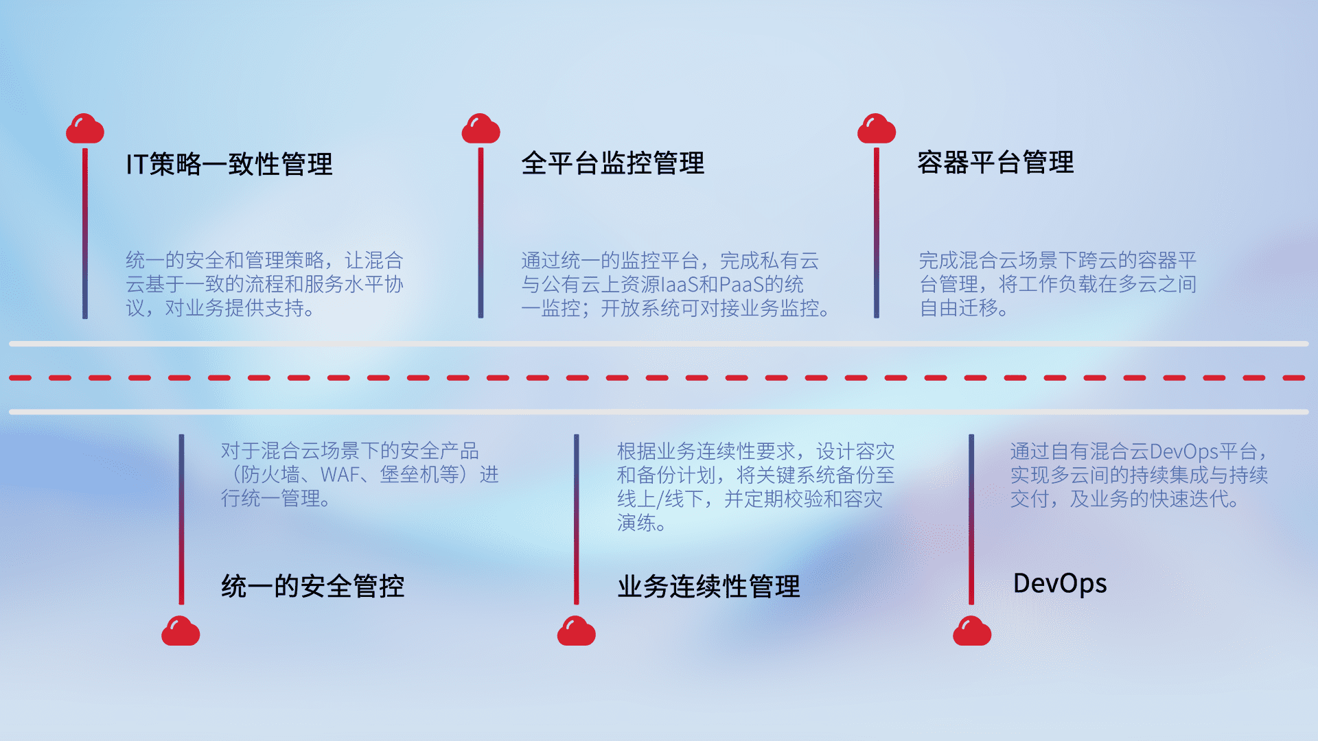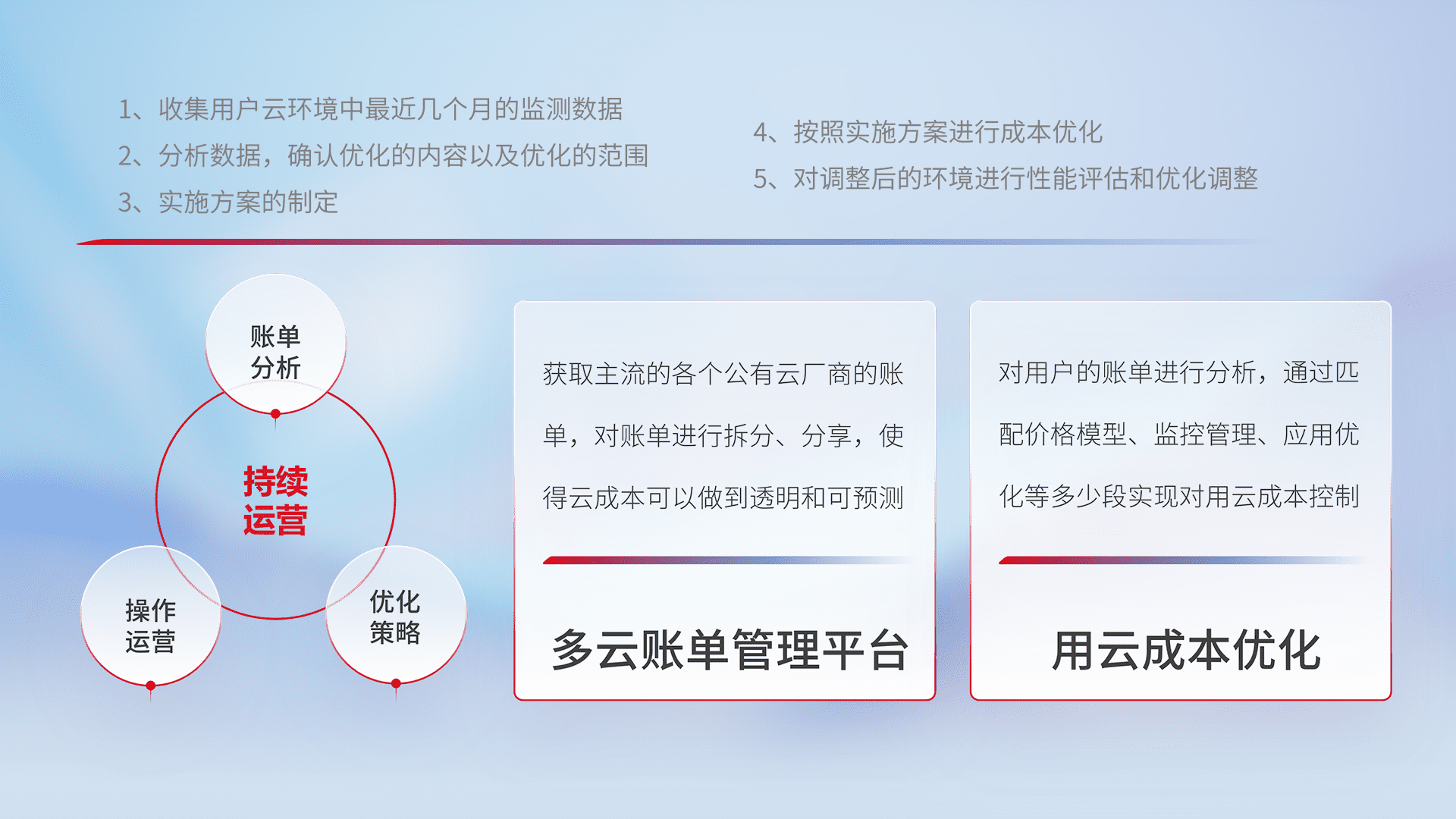 通过多云纳管,,以统一的资源数据模型把客户的云资源进行抽象和封装,,进而实现对多云资源的统一操作,,,保障云资源管理的可靠性、、、、稳定性与可用性。。。。量身定制化运维内容,,,配置、、开发运维、、、、补丁管理、、备份、、、、监控、、、、认证和访问管理、、、、审计和日常巡检等,,,,保障在用云过程中的可靠度,,,稳定度以及高可用率。。。。